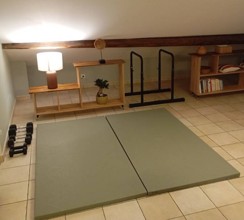 J'ai équipé mon cabinet de matériel simple : tapis de gymnastique, haltères légers, barre à DIPS. Si cela semble pertinent dans votre accompagnement personnalisé, je vous montrerai certains exercices à votre portée et que vous pourrez pratiquer chez vous.